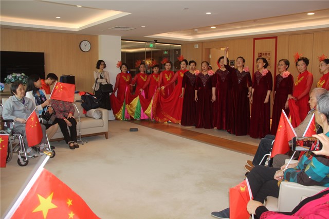 离退休党工委组织为颐养中心的老人们表演了小合唱《微山湖》、舞蹈《祖国颂》。悦耳的歌声、优美的舞蹈抒发了南京医科大学离退休老同志对祖国的无限热爱,博得在场老人的阵阵掌声和连声喝彩。最后,全场同志齐声高歌《我和我的祖国》,现场洋溢着欢乐和谐的氛围。此外,党工委委员们还与老人门进行了热情的交流,了解他们的身体状况和日常起居情况,并对他们表达了深深的祝福。