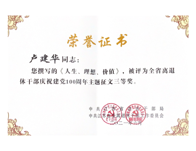 我校退休同志积极响应、热情参与、踊跃投稿,他们将心中对党的热爱与忠诚诉诸笔端,以笔抒怀,以文言志,挥毫泼墨,讲述了自己的亲身经历和所学所思,表达了自己的真实情感和美好祝愿。离退休党工委推荐了6篇征文参加了该活动。最后,省委老干部局经过综合评审,在全省近2000篇征文中,评选出300篇获奖作品,其中一等奖20篇,二等奖50篇,三等奖230篇。我校退休同志卢建华教授的征文《人生、理想、价值》荣获本次主题征文三等奖。